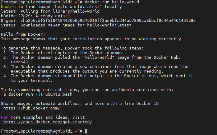 [root@iZbp10lcromzmqh9gml6idZ ~]# docker run hello-world //运行名为hello-world镜