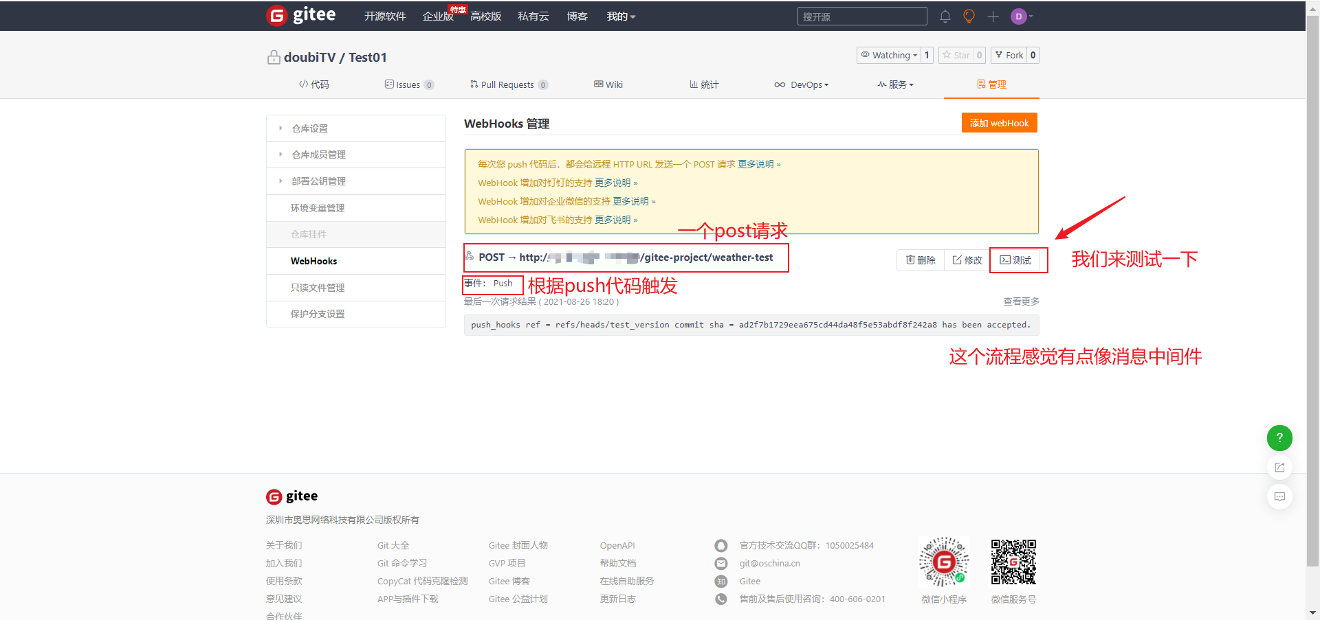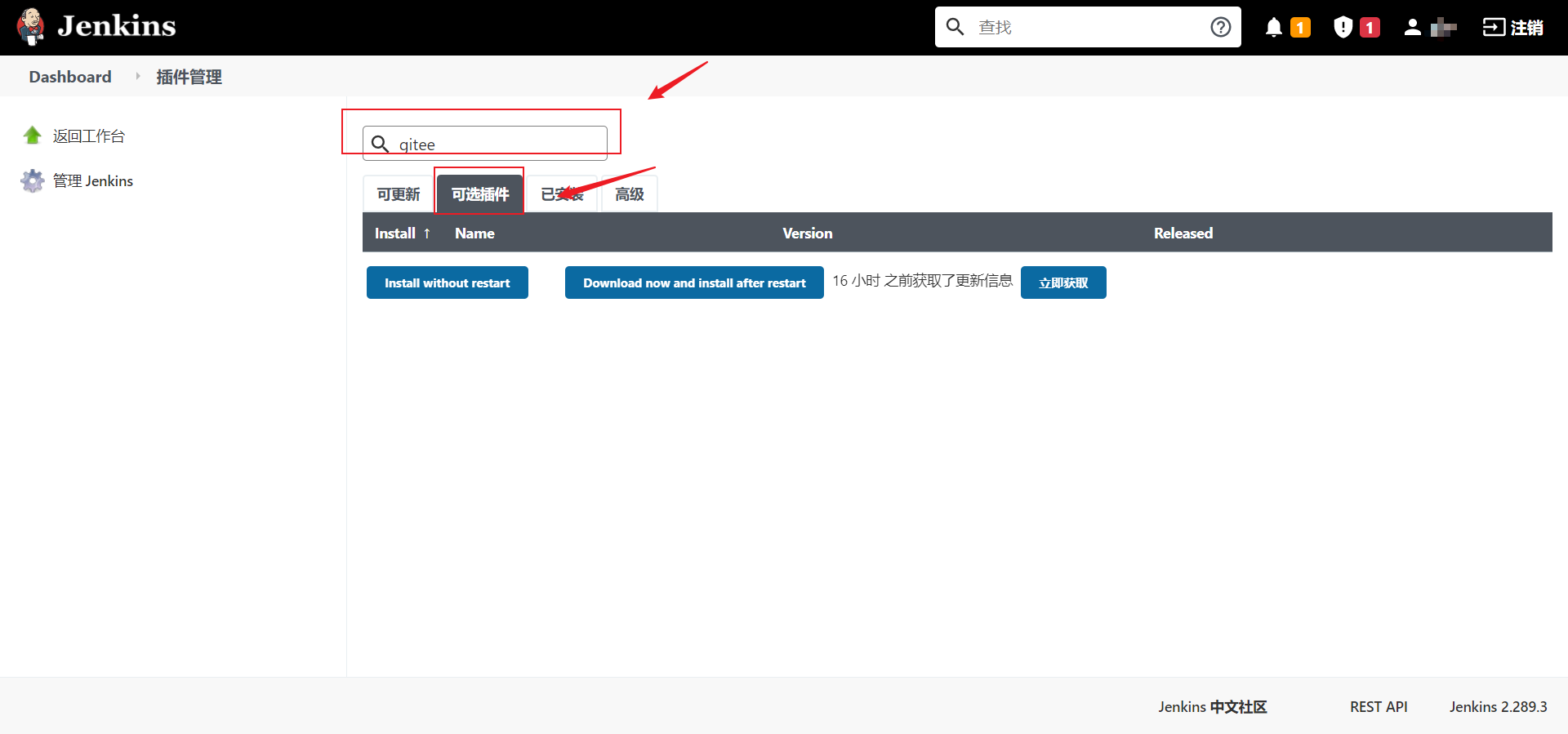 基本的Jenkins环境搭好,现在根据需求配置Jenkins;我的目的是每次提交gitee的test分支自动构建项目,同时该项目一直处于运行状态——测试环境;我们先根据gitee官方文档指示下载gitee插件