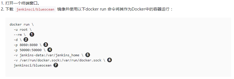 docker run -u root --rm -d -p 8080:8080 -p 50000:50000 -v jenkins-data:/var/jenkins_home -v /var/run/docker.sock:/var/run/docker.sock jenkinsci/blueocean