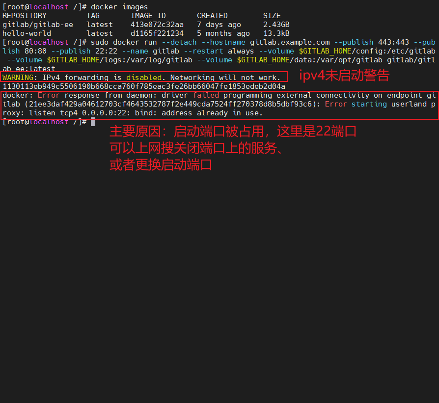 修复好ipv4警告、删除刚才运行失败的容器、更换启动端口再次启动