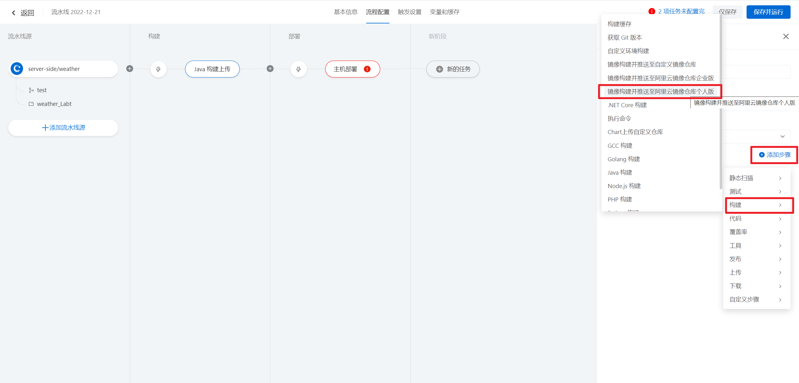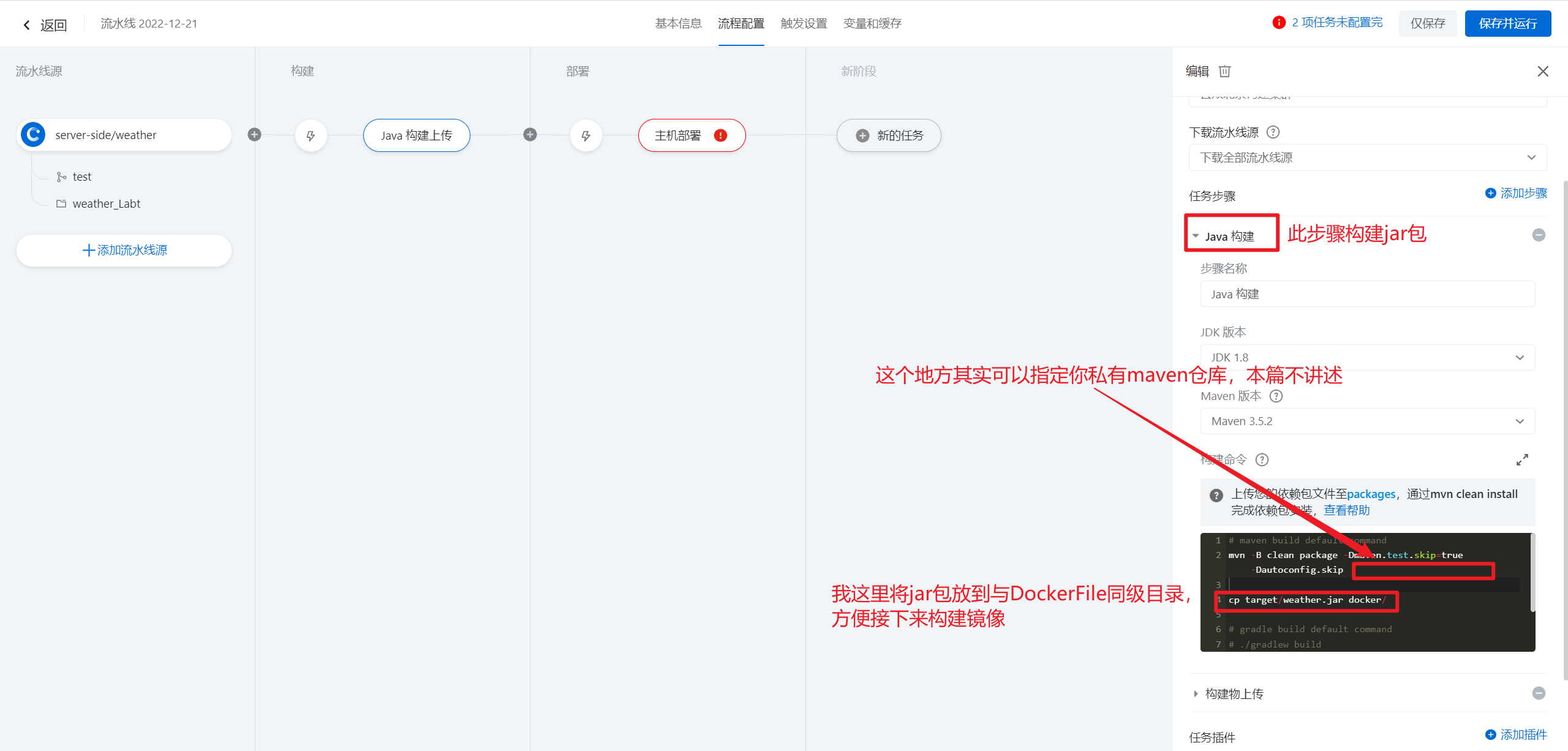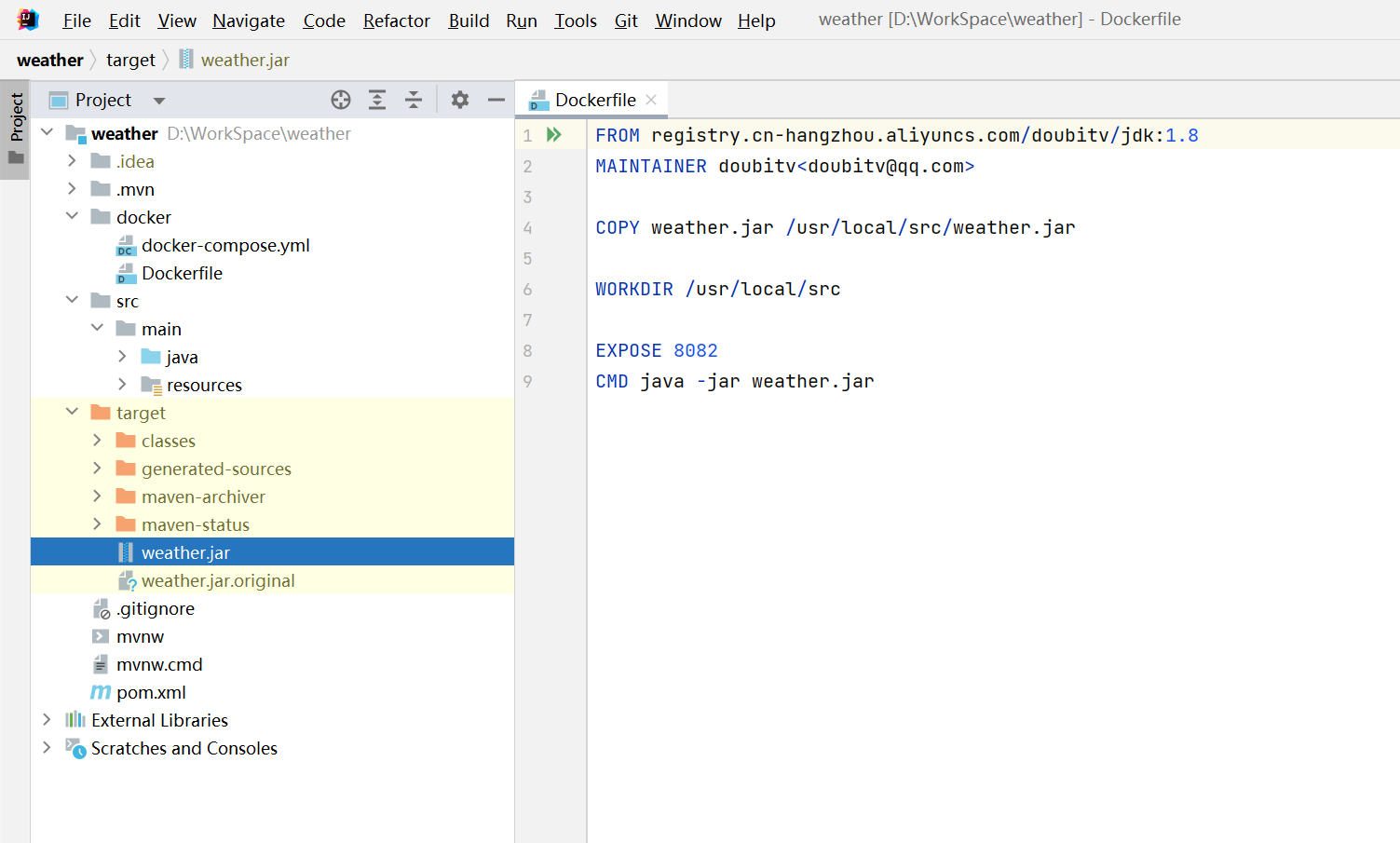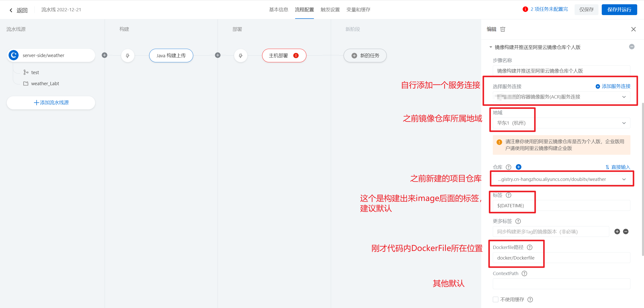 CMD java -jar weather.jar这里的基础镜像建议使用我们之前上传到阿里镜像仓库路径,主要就是图快,保证不会因为下载镜像超时导致流程失败;