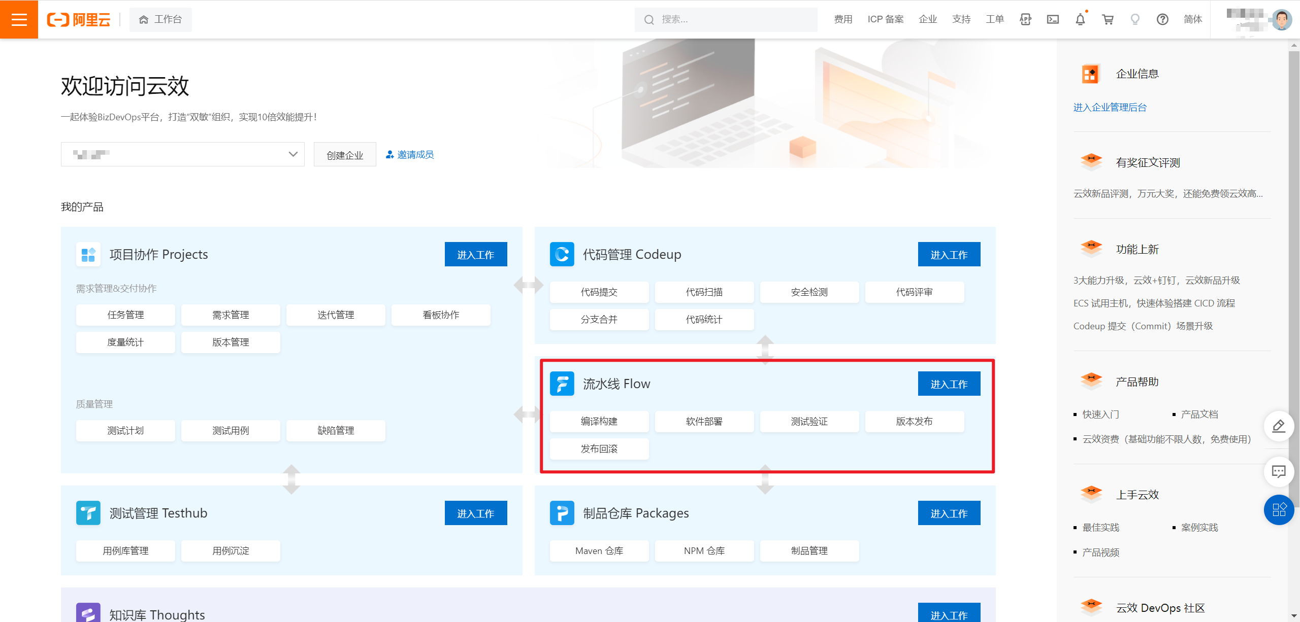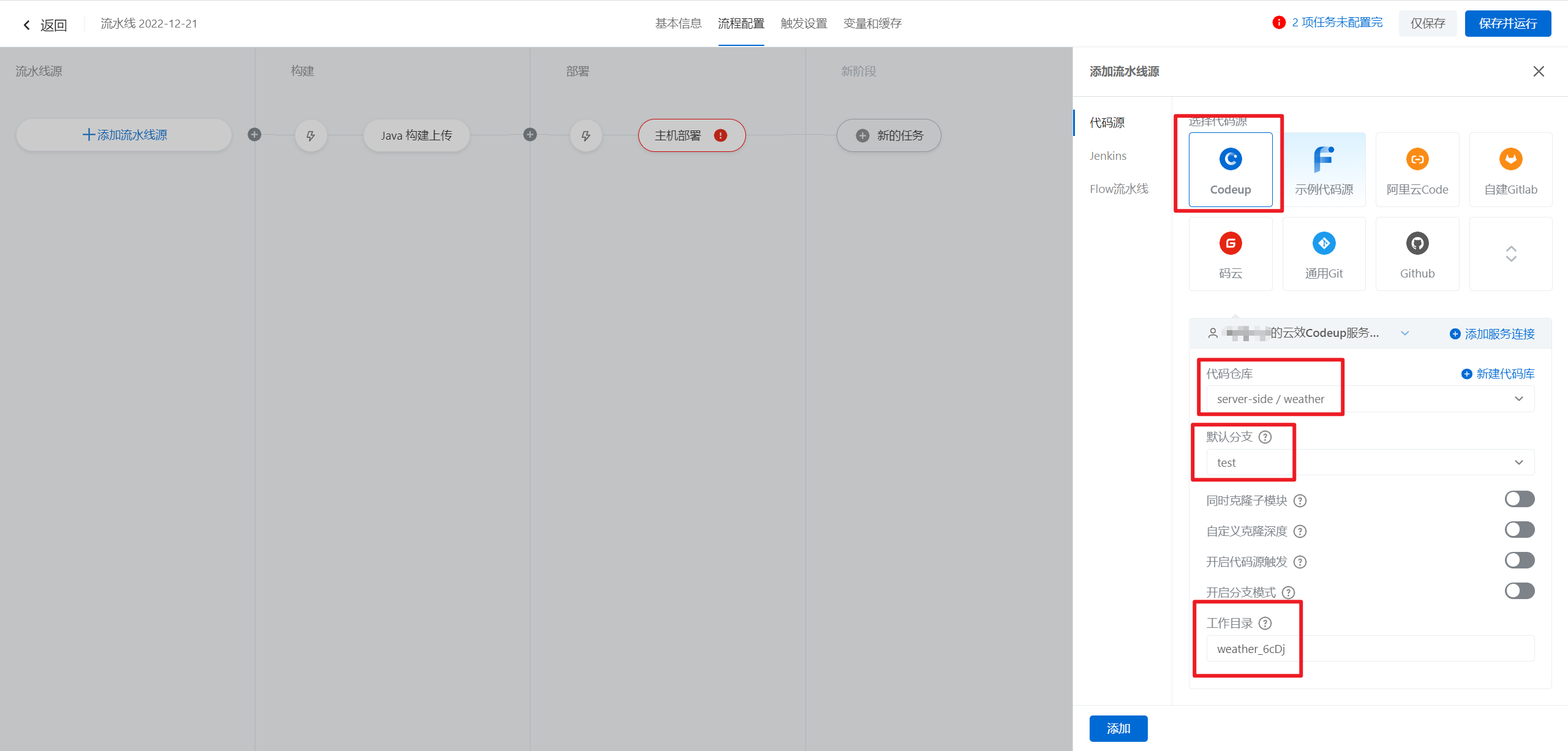 由于我目前用的是云效的代码仓库,所以它给我自动带过来了;选择你想要部署的分支,我用测试环境test;工作目录可以不用管,自动生成;