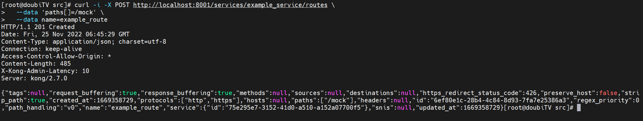 Routes的配置决定了Kong如何进行代理。您可以通过向服务URL发送POST请求来创建与特定服务关联的路由。 在/mock路径上配置一个新路由,将流量导向前面创建的example_service服务: